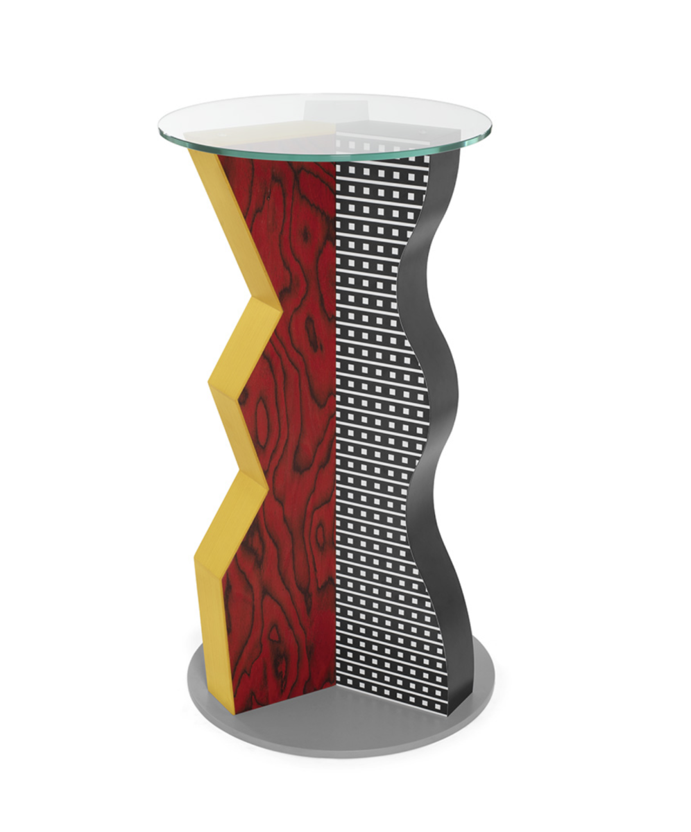 Ivory , magnifique selette dessinée par Ettore Sottsass en 1985 . Elle se présente comme une véritable sculpture , mais elle peut aussi valoriser les objets ou lampes que vous allez choisir de poser .