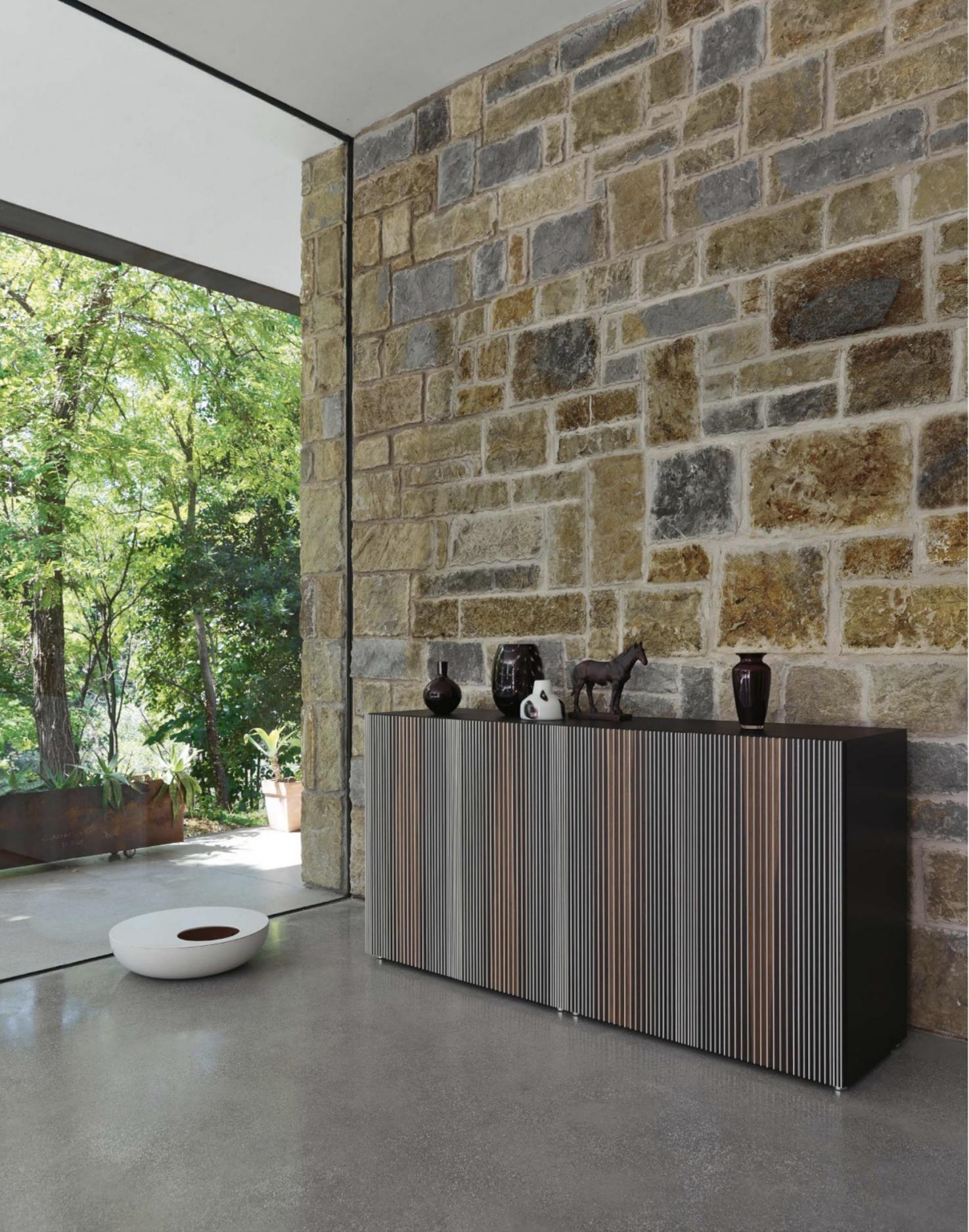 Sa structure est en panneaux de particules de bois plaqués teints ou laqués . Ses portes sont en nid d'abeille MDF avec des renforts métalliques transversaux internes et sont plaquées de chêne thermo-traité et fraisées verticalement pour recevoir des inserts verticaux en stratifié .les tablettes intérieures sont en verre ou en bois sur demande .La hauteur des pieds en ABS est de 2cm ou peuvent être remplaces par des bases métalliques H12cm ou H16cm