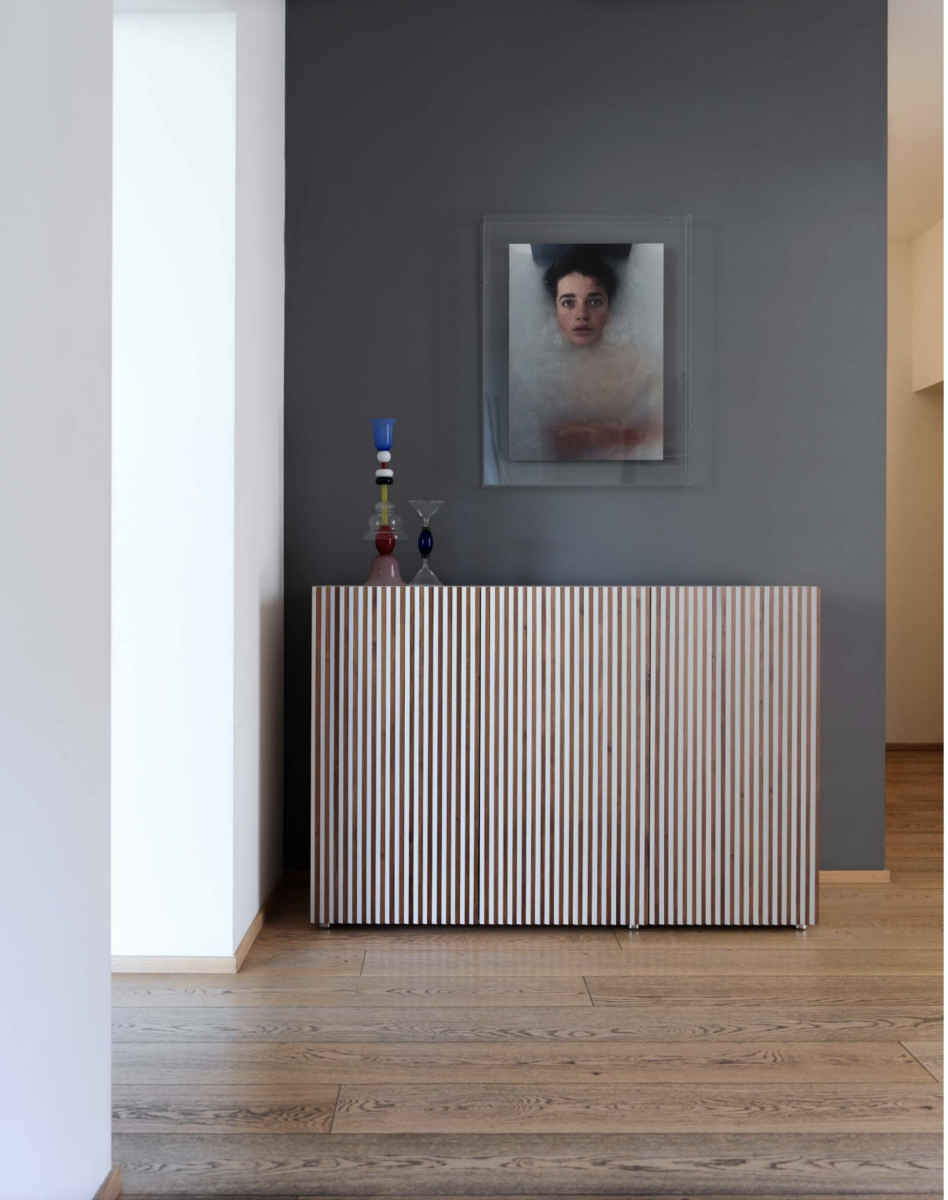 CARLOS , ne ressemble à aucun autre buffet avec sa façade surprenante par ce dégradé de couleurs . Nous n'avons pas le même visuel selon si on le regarde de face ou de profil .En hauteur ou en longueur , CARLOS a une grande capacité de rangement .