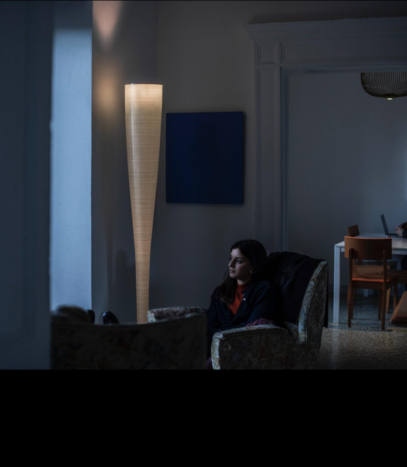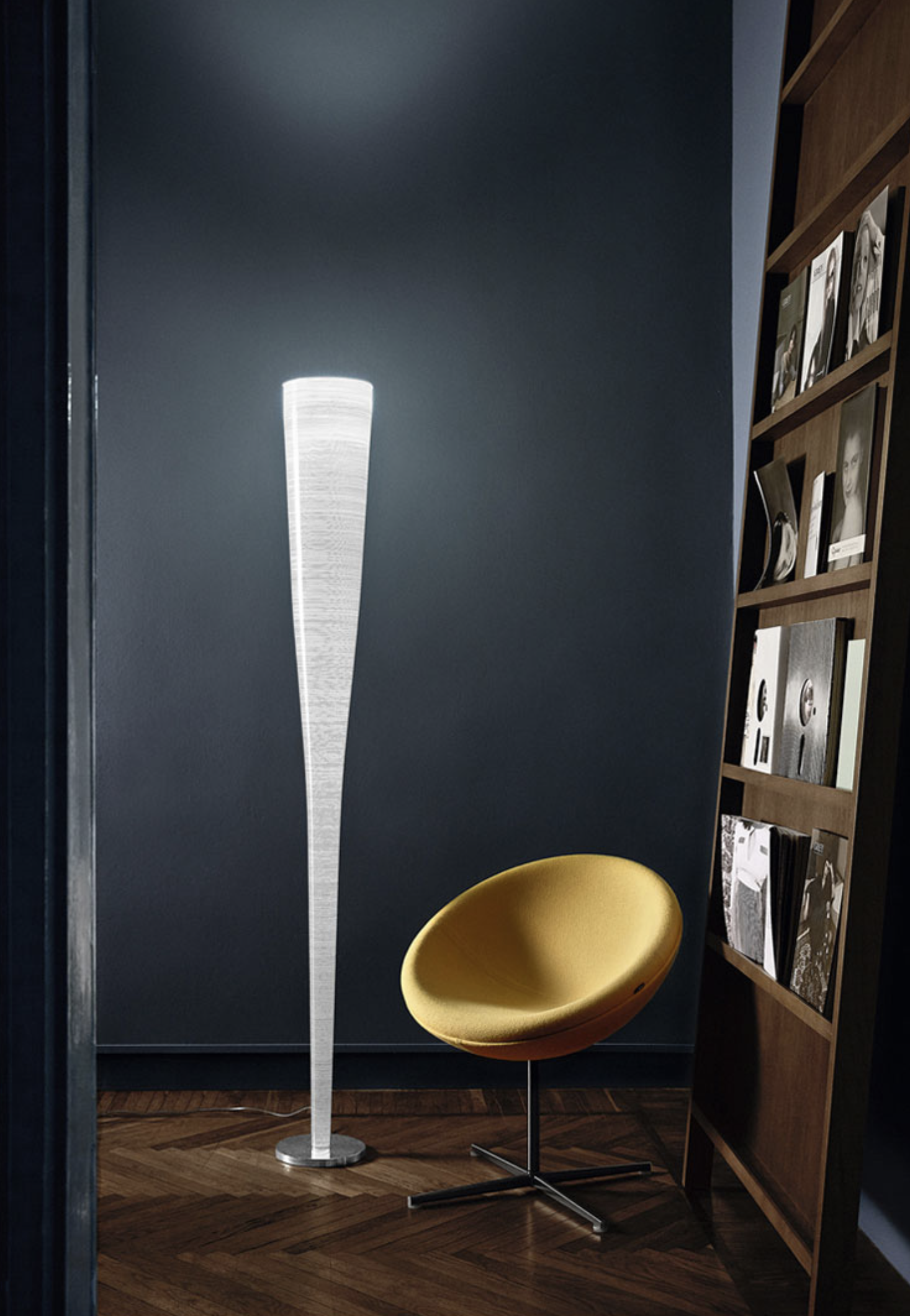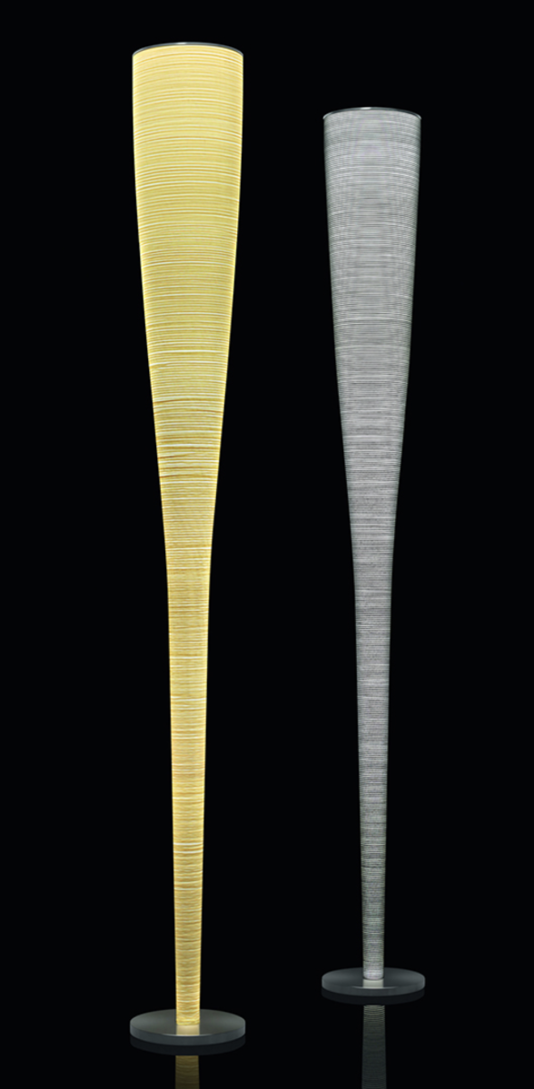 Le lampadaire MITE TERRA est le laureat 2001 de " COMPASSO D'ORO . Il est à la fois léger et élégant grâce au matériau choisi par Marc Sadler qui est de la fibre de verre , veiné fil de carbone noir ou jaune